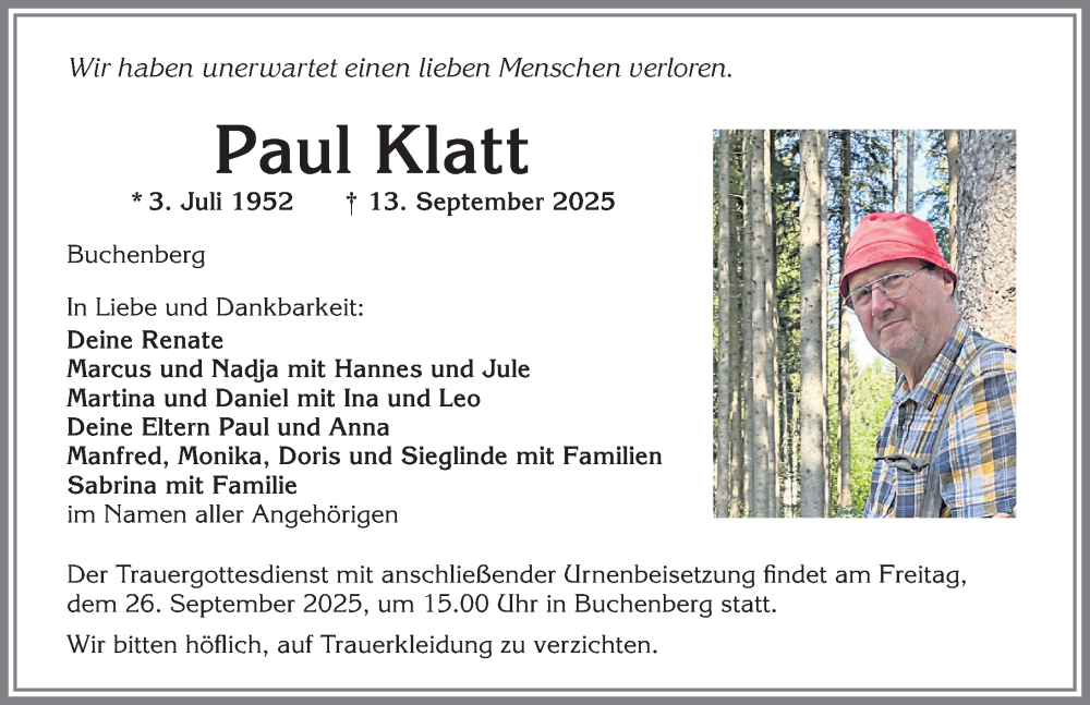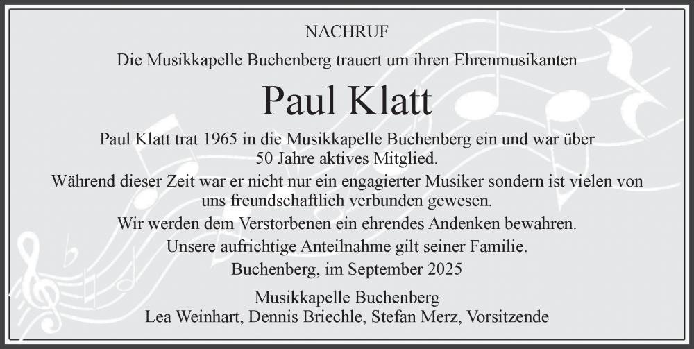 Hier finden Sie alle Traueranzeigen aus der Zeitung, die bisher für Paul Klatt erschienen sind. Weitere Traueranzeigen, die in der Zeitung erscheinen, werden hier ebenfalls aufgelistet