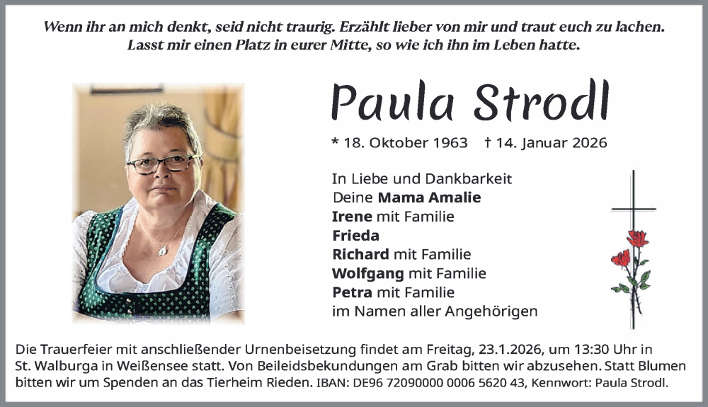 Hier finden Sie alle Traueranzeigen aus der Zeitung, die bisher für Paula Strodl erschienen sind. Weitere Traueranzeigen, die in der Zeitung erscheinen, werden hier ebenfalls aufgelistet