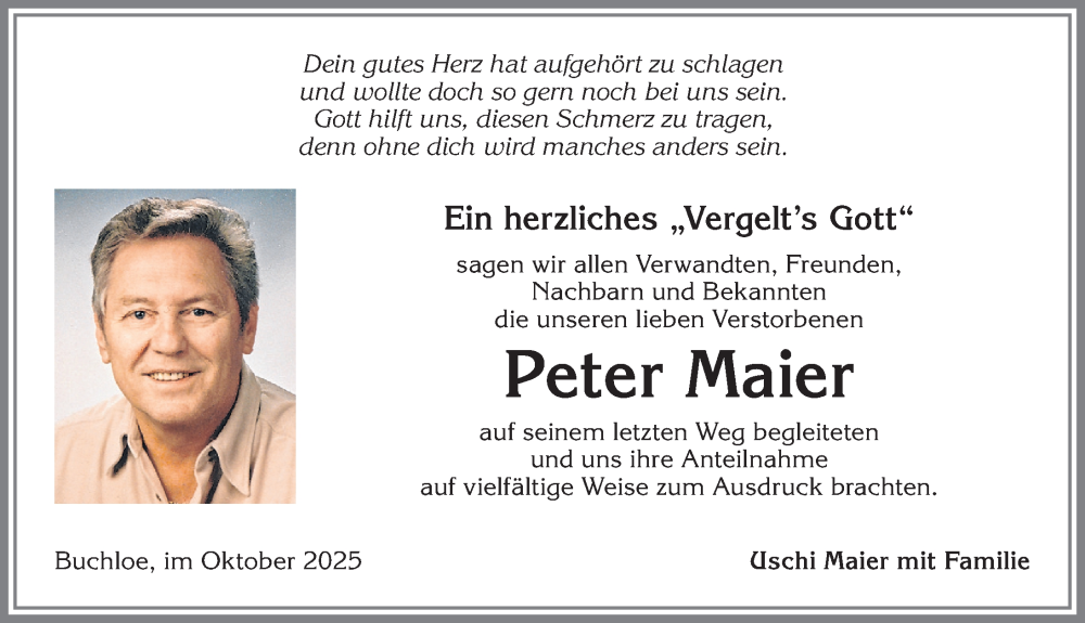 Hier finden Sie alle Traueranzeigen aus der Zeitung, die bisher für Peter Maier erschienen sind. Weitere Traueranzeigen, die in der Zeitung erscheinen, werden hier ebenfalls aufgelistet