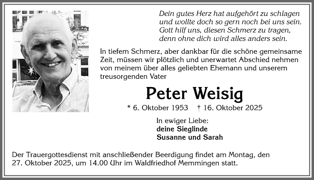 Hier finden Sie alle Traueranzeigen aus der Zeitung, die bisher für Peter Weisig erschienen sind. Weitere Traueranzeigen, die in der Zeitung erscheinen, werden hier ebenfalls aufgelistet