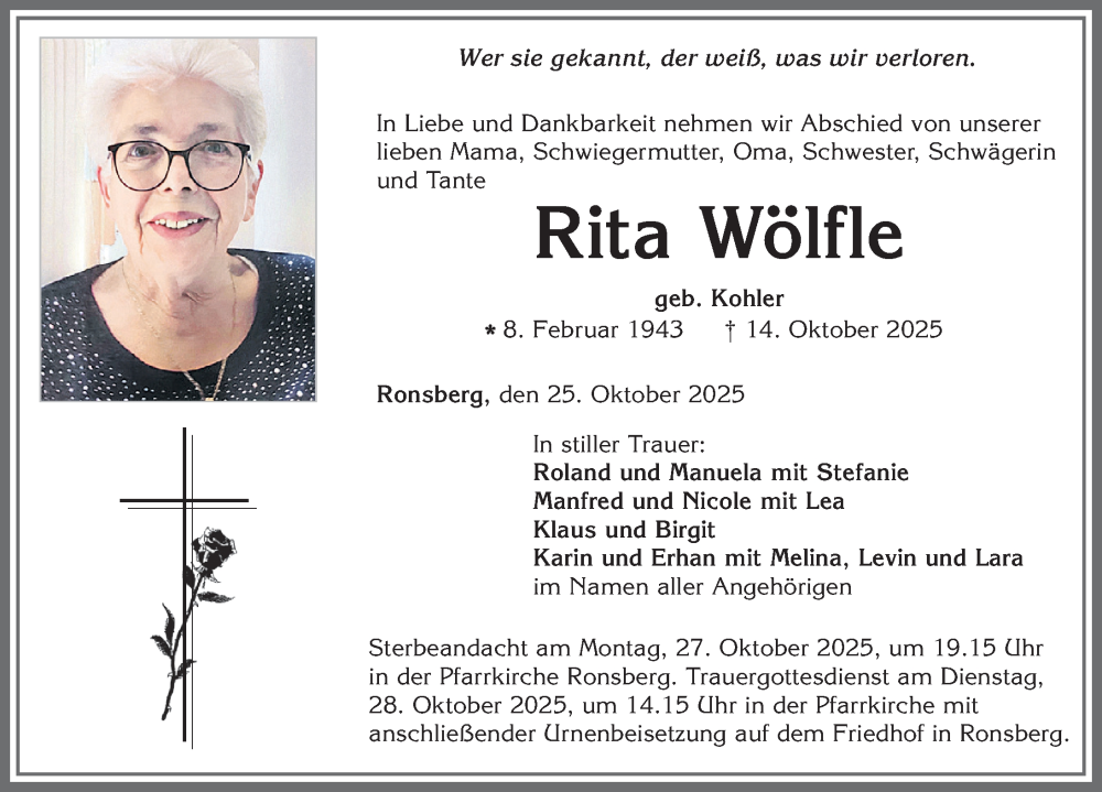 Hier finden Sie alle Traueranzeigen aus der Zeitung, die bisher für Rita Wölfle erschienen sind. Weitere Traueranzeigen, die in der Zeitung erscheinen, werden hier ebenfalls aufgelistet
