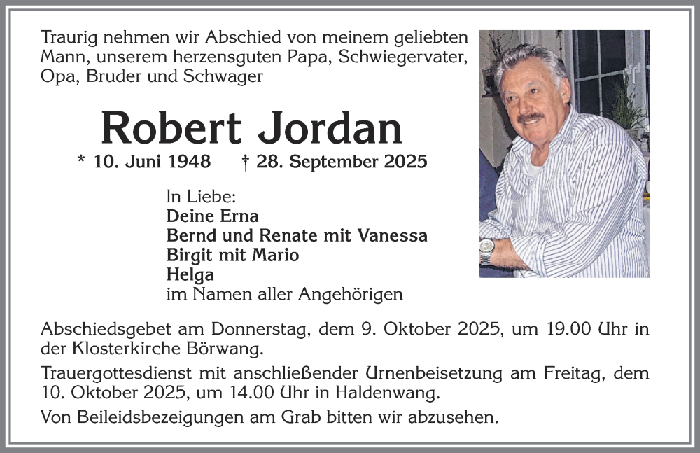 Hier finden Sie alle Traueranzeigen aus der Zeitung, die bisher für Robert Jordan erschienen sind. Weitere Traueranzeigen, die in der Zeitung erscheinen, werden hier ebenfalls aufgelistet