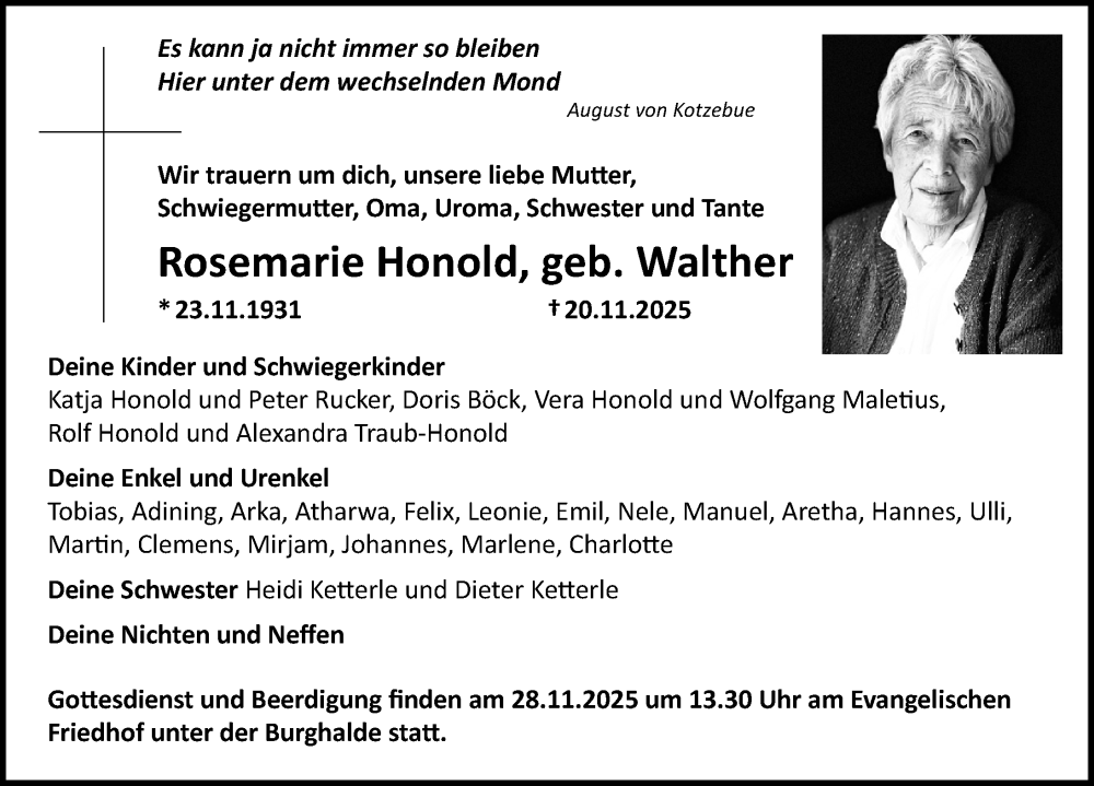 Hier finden Sie alle Traueranzeigen aus der Zeitung, die bisher für Rosemarie Honold erschienen sind. Weitere Traueranzeigen, die in der Zeitung erscheinen, werden hier ebenfalls aufgelistet