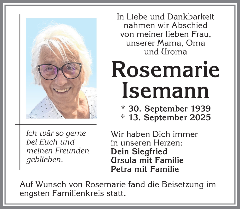 Hier finden Sie alle Traueranzeigen aus der Zeitung, die bisher für Rosemarie Isemann erschienen sind. Weitere Traueranzeigen, die in der Zeitung erscheinen, werden hier ebenfalls aufgelistet