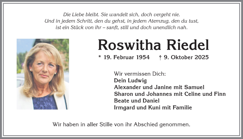 Hier finden Sie alle Traueranzeigen aus der Zeitung, die bisher für Roswitha Riedel erschienen sind. Weitere Traueranzeigen, die in der Zeitung erscheinen, werden hier ebenfalls aufgelistet