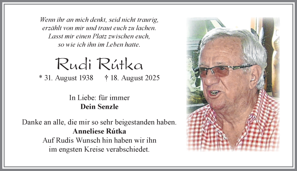 Hier finden Sie alle Traueranzeigen aus der Zeitung, die bisher für Rudi Rútka erschienen sind. Weitere Traueranzeigen, die in der Zeitung erscheinen, werden hier ebenfalls aufgelistet