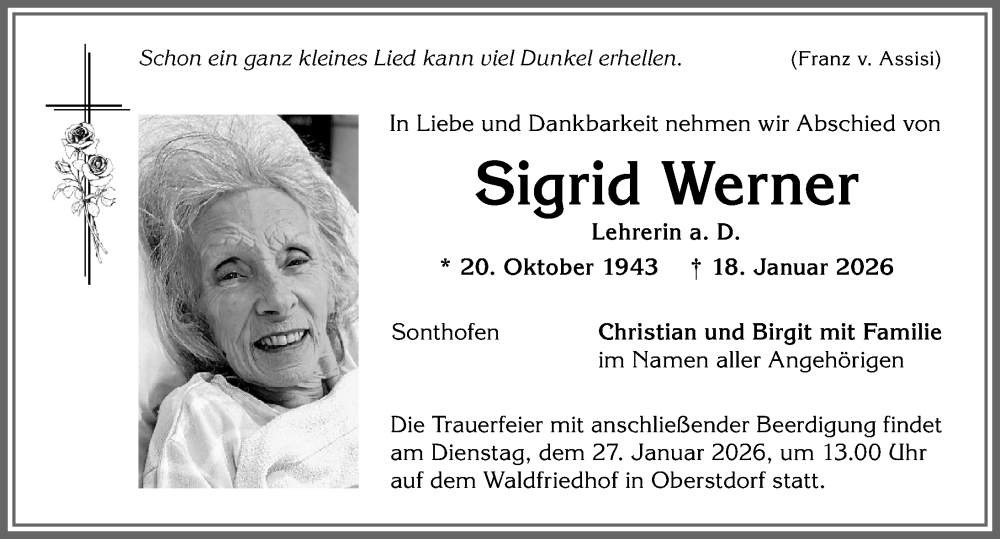 Hier finden Sie alle Traueranzeigen aus der Zeitung, die bisher für Sigrid Werner erschienen sind. Weitere Traueranzeigen, die in der Zeitung erscheinen, werden hier ebenfalls aufgelistet