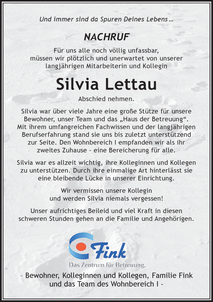 Hier finden Sie alle Traueranzeigen aus der Zeitung, die bisher für Silvia Lettau erschienen sind. Weitere Traueranzeigen, die in der Zeitung erscheinen, werden hier ebenfalls aufgelistet