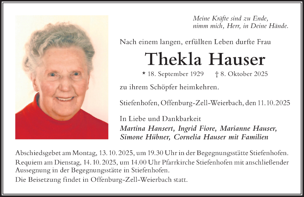 Hier finden Sie alle Traueranzeigen aus der Zeitung, die bisher für Thekla Hübner erschienen sind. Weitere Traueranzeigen, die in der Zeitung erscheinen, werden hier ebenfalls aufgelistet