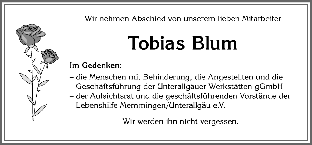 Hier finden Sie alle Traueranzeigen aus der Zeitung, die bisher für Tobias Blum erschienen sind. Weitere Traueranzeigen, die in der Zeitung erscheinen, werden hier ebenfalls aufgelistet