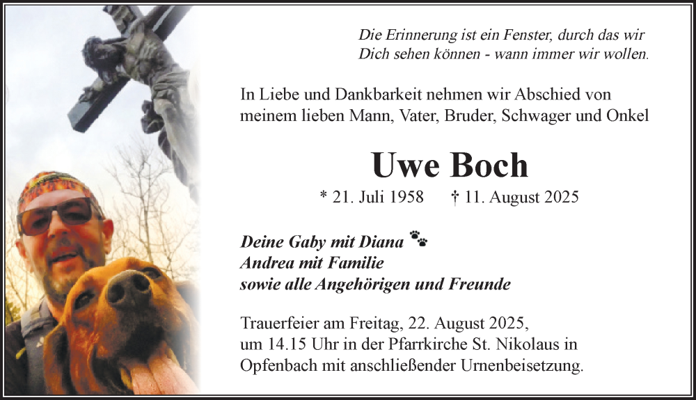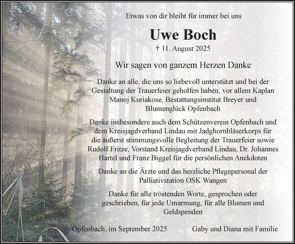 Hier finden Sie alle Traueranzeigen aus der Zeitung, die bisher für Uwe Boch erschienen sind. Weitere Traueranzeigen, die in der Zeitung erscheinen, werden hier ebenfalls aufgelistet