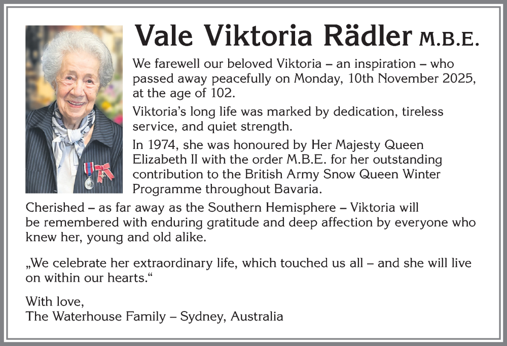 Hier finden Sie alle Traueranzeigen aus der Zeitung, die bisher für Viktoria Rädler erschienen sind. Weitere Traueranzeigen, die in der Zeitung erscheinen, werden hier ebenfalls aufgelistet