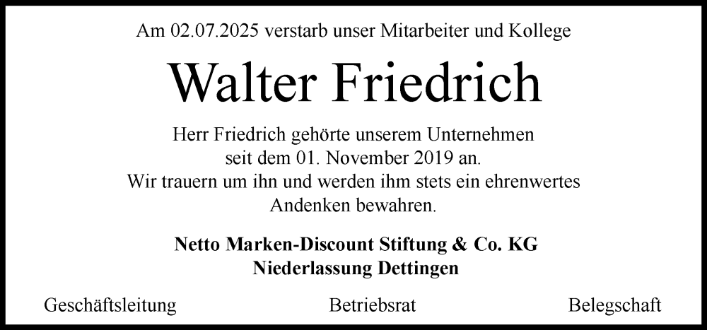 Hier finden Sie alle Traueranzeigen aus der Zeitung, die bisher für Walter Friedrich erschienen sind. Weitere Traueranzeigen, die in der Zeitung erscheinen, werden hier ebenfalls aufgelistet