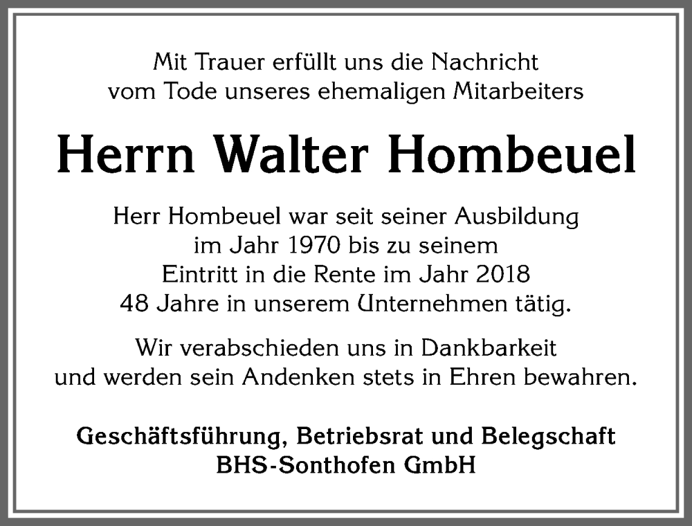 Hier finden Sie alle Traueranzeigen aus der Zeitung, die bisher für Walter Hombeuel erschienen sind. Weitere Traueranzeigen, die in der Zeitung erscheinen, werden hier ebenfalls aufgelistet