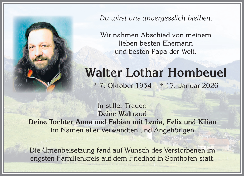 Hier finden Sie alle Traueranzeigen aus der Zeitung, die bisher für Walter Lothar Hombeuel erschienen sind. Weitere Traueranzeigen, die in der Zeitung erscheinen, werden hier ebenfalls aufgelistet