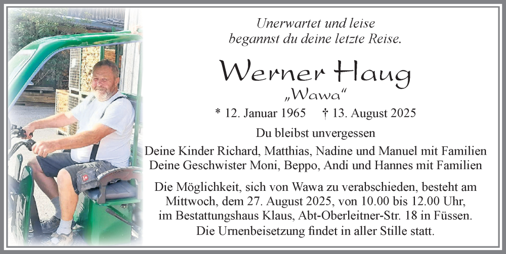 Hier finden Sie alle Traueranzeigen aus der Zeitung, die bisher für Werner Haug erschienen sind. Weitere Traueranzeigen, die in der Zeitung erscheinen, werden hier ebenfalls aufgelistet