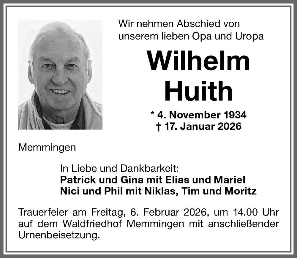 Hier finden Sie alle Traueranzeigen aus der Zeitung, die bisher für Wilhelm Huith erschienen sind. Weitere Traueranzeigen, die in der Zeitung erscheinen, werden hier ebenfalls aufgelistet