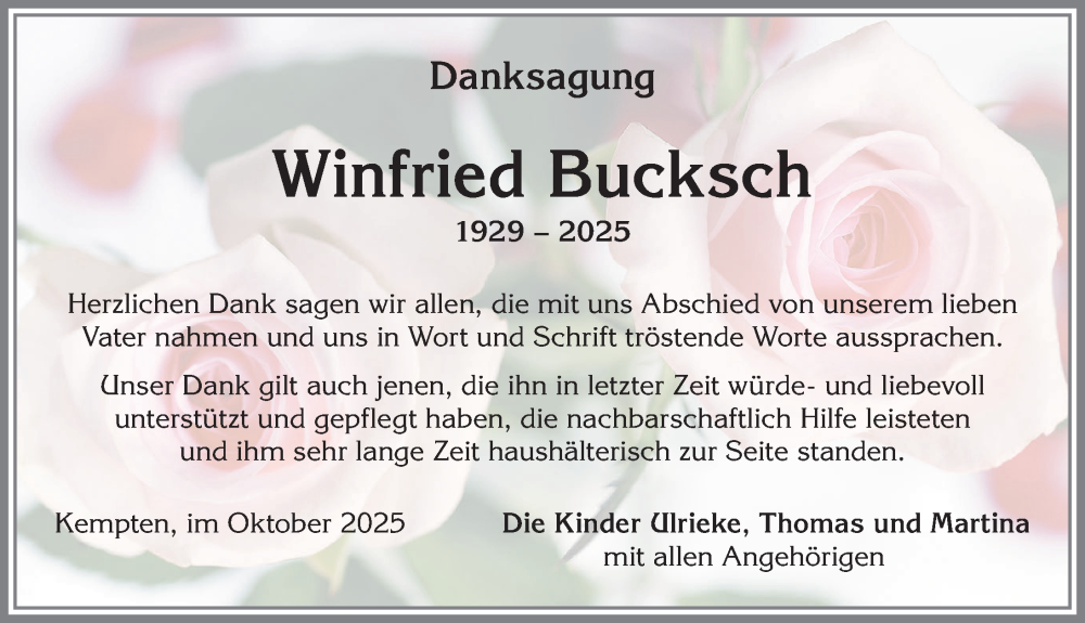 Hier finden Sie alle Traueranzeigen aus der Zeitung, die bisher für Winfried Bucksch erschienen sind. Weitere Traueranzeigen, die in der Zeitung erscheinen, werden hier ebenfalls aufgelistet