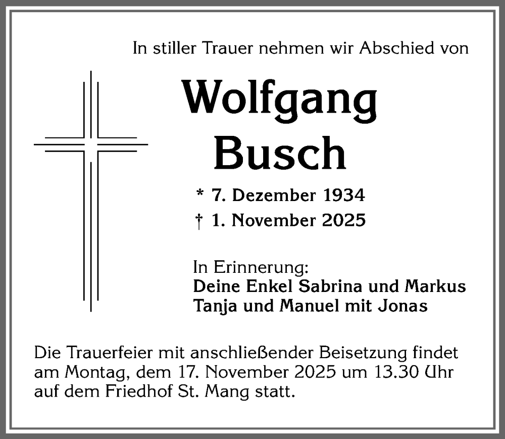 Hier finden Sie alle Traueranzeigen aus der Zeitung, die bisher für Wolfgang Busch erschienen sind. Weitere Traueranzeigen, die in der Zeitung erscheinen, werden hier ebenfalls aufgelistet